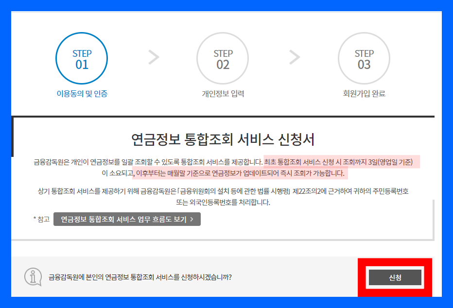 연금정보 통합조회 서비스 신청을 할 수 있습니다. 신청 후 영업일 기준으로 3일 후부터 조회가 가능하고, 매월 말 연금정보가 업데이트가 되어서 확인이 가능하다고 합니다.