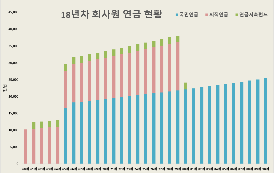 그래서 나이별로 받을수 있는 예상수령액을 보기좋게 재원별로 엑셀 표로 나타내 보았습니다. 국민연금은 65세부터 평생 나오는 것이고, 나머지 퇴직연금, 연금저축펀드는 20년에 나누어 받는 걸로 지정해놨나 봐요.