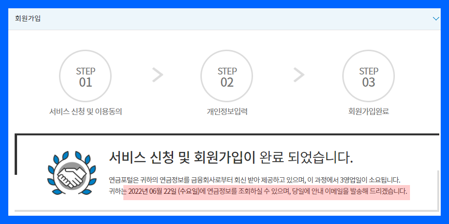 신청이 완료되면 언제부터 연금조회가 가능한 지 확인할 수 있습니다.