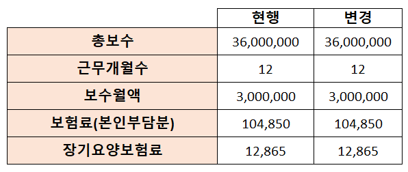 예를 들어 직장에서 받은 보수총액이 3,600만 원이라면, 12개월 근무했다면, 보수월액은 300만 원이고, 보험료율 6.99%를 곱하면 보수월액 보험료는 209,700원으로 계산되는데 본인부담금은 50%이므로 104,850원입니다. 여기에 장기요양보험료는 장기요양 보험료율 12.27%를 곱하니 12,865원으로 계산됩니다.