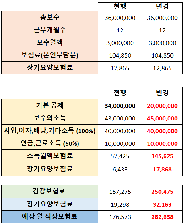 예시로 총 보수 3,600만 원 + 보수 외 수익 4,000만 원을 산정했을 때 보수월액과 소득월액 보험료를 합하니 250,475원이 나오고, 장기요양보험료 32,163원을 합하면 예상 월 직장보험료는 282,638원을 납부해야 합니다. 예시의 경우라면 변경된 정책에 의해 약 10만 원 정도의 직장보험료를 납부할 것으로 예상됩니다.