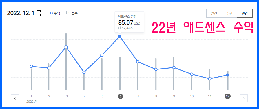 그다음으로 애드센스와 애드포스트 즉 블로그에 글을 써서 광고 수익을 받는 것이 그 다음으로 많네요. 21년에는 주고 블로그로 수익을 대부분 냈었는데요. 올해에는 글 쓰는데 지치기도 했고, 데이터 라벨링에 시간을 많이 쏟다 보니 한 달에 3-4개 정도의 글 밖에 쓰지 못했어요. 그래도 한 달에 6-10만 원 정도의 수익을 가져다주더라고요. 여기에 쿠팡 파트너스라고 물건을 구매한 후 블로그에 글을 쓰고 쿠팡 상품 링크를 연동해 뒀더니 거기에서도 많지는 않지만 매달 1만 원 정도의 수익이 나고 있어요. 글을 거의 쓰지 못했지만, 블로그에서 약 7-10만 원의 수익이 발생하고 있습니다.