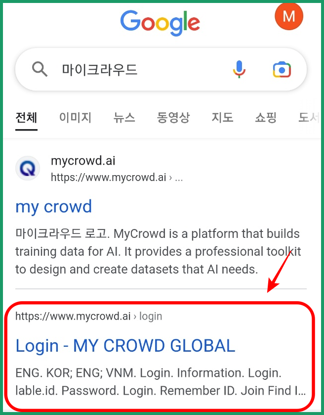 구글에서 "마이크라우드"라고 검색해서 들어가 볼게요. "마이 크라우드 글로벌"을 선택해 줍니다.