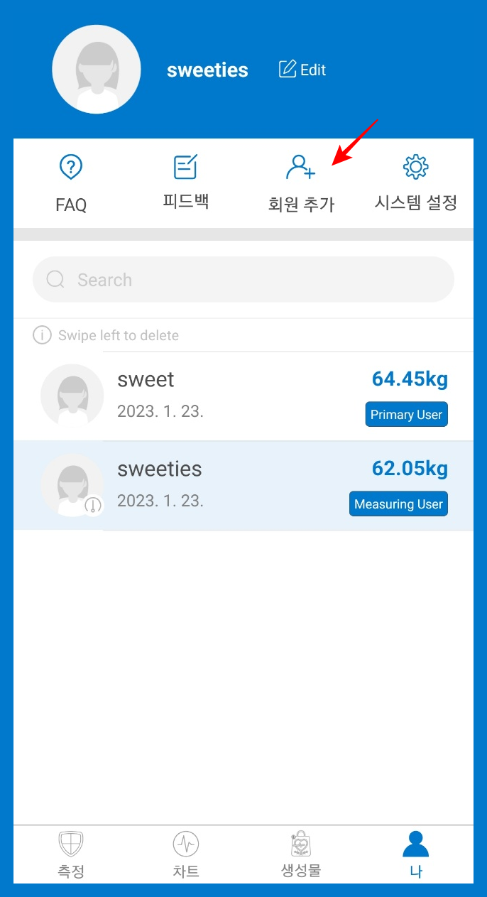 가족들 프로필도 추가하여 만들 수 있고, '베이비 사용자'를 추가하면 아기와 반려동물도 체성분 분석을 할 수 있더라고요. 체성분 분석할 때 본인 이름 선택 후 체중계에 올라가면 체성분 분석이 되고 기록에 남아요.