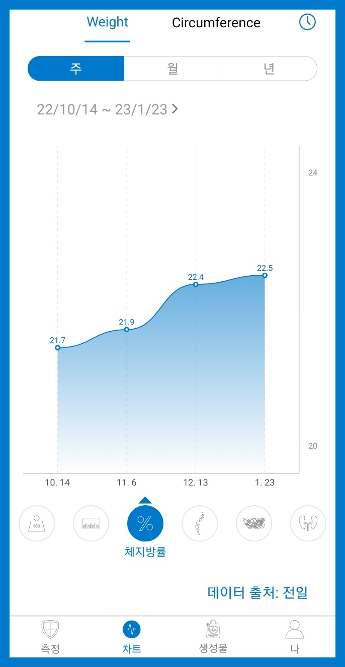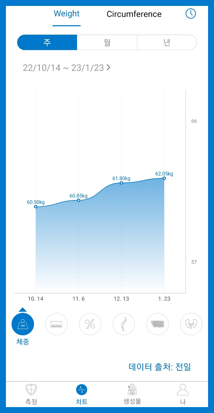 4개월 정도 사용했고 매달 체성분 분석을 해봤어요. 연말과 연초에 잘 챙겨 먹었더니, 체중과 체지방률(%)이 우상향하는 모습입니다.