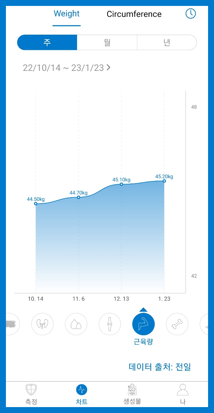 그래도 운동을 계속 하고 있어서 그런지 근육량과 기초대사량은 늘었네요.