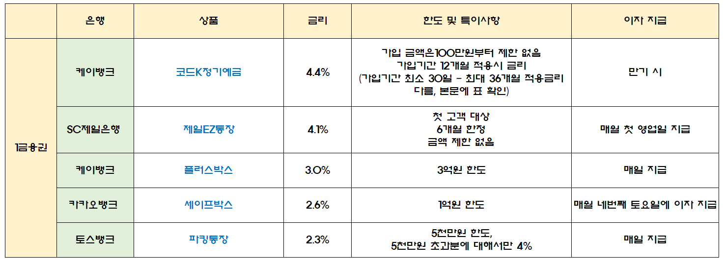 5천만 원 예금자 보호가 되는 파킹통장 및 예금 그리고 이벤트 정리해봤습니다 (23년 1월 24일 기준). 저도 업데이트를 계속 할 생각이라, 해당 금융상품명 클릭하면 해당 은행 홈페이지로 바로 이동할 수 있도록 해두었어요. 파킹통장 금리 높은 순서로 정리해 보았고, 아래에는 1금융권과 2금융권을 나눠서 표로 정리했으니 참고해 주세요. 저도 정리차원에서 한거라 내용이 부족하고, 틀린 부분 있을 수 있습니다.