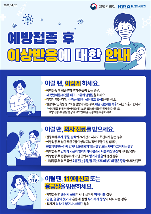 팬데믹으로 인해 충분한 임상을 거치지 않고 긴급승인 된만큼 중요한 것은 백신 접종을 했다는 것을 주변사람들에게 알리고, 접종 후 본인의 몸 상태에 귀를 기울이는 것이 아닐까 생각합니다.
