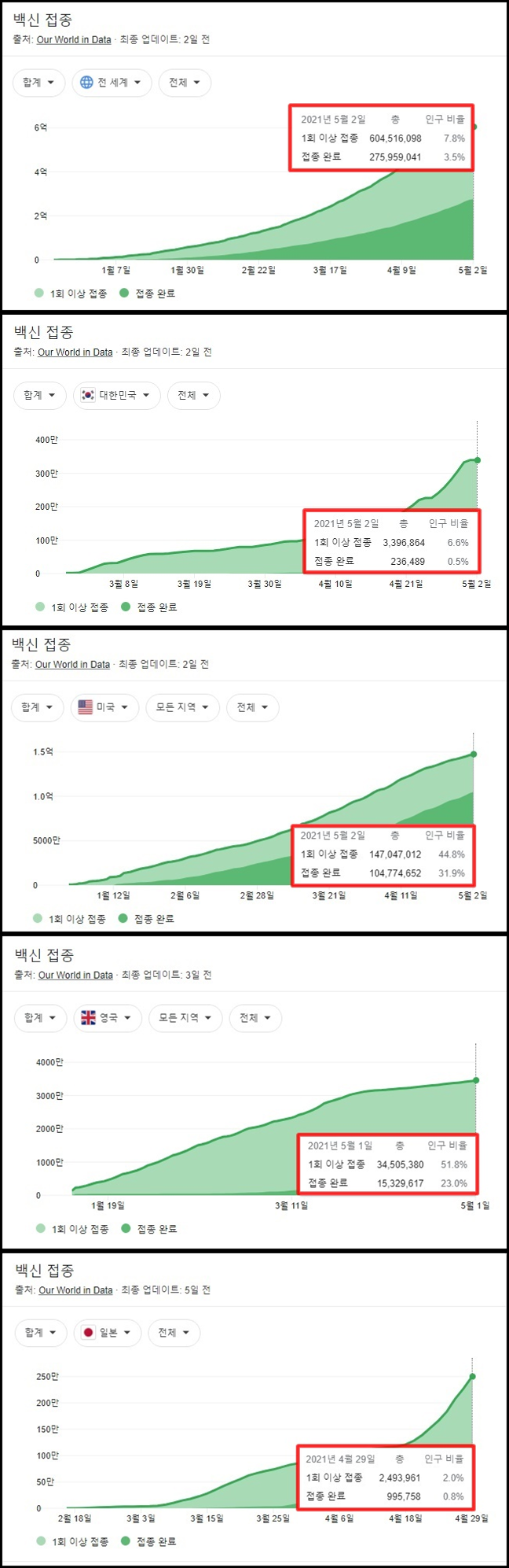 전세계, 한국, 미국, 영국, 일본 백신 접종 현황