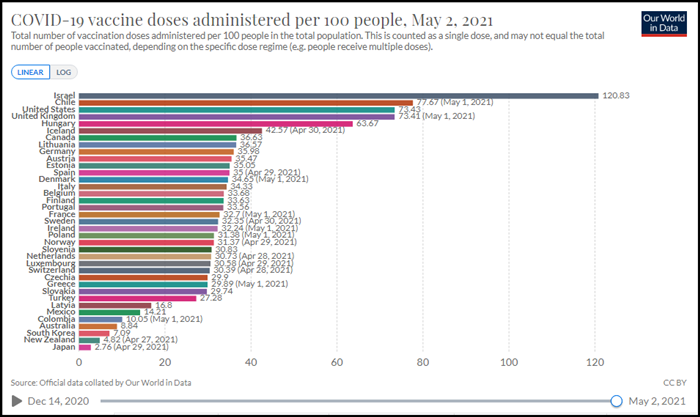 옥스포드대학교 마틴스쿨 집계에 따르면 한국의 인구 대비 백신 접종률은 5월 2일 기준으로 7.09% (1차 접종 포함)이라고 하네요. 우리나라의 백신 접종률은 OECD 37개국 중 35위이고, 이스라엘, 칠레, 미국, 영국, 헝가리가 인구 대비 높은 백신 접종률을 보이고 있습니다.