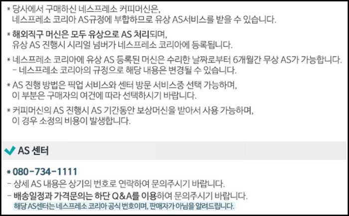 단점이 있다면, 해외직구 상품이라 AS를 하려면 유상으로 해야한다는 점입니다. 판매자의 정보에 의하면, 네스프레소 커피머신은 네스프레소 코리아 AS 규정에 부합하므로 유상 AS 서비스를 받을 수 있고, 지금 이 제품처럼 해외직구로 구매한 머신은 모두 유상으로 AS를 받을 수 있다고 합니다. 이렇게 한 번 유상으로 AS를 받으면 수리한 날짜로부터 6개월간 무상 AS가 가능하다고 하네요. 네스프레소 커피머신 AS센터 전화번호는 080-734-1111입니다. 부디 고장이 나지 않길 바라봅니다.
