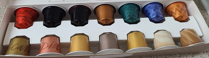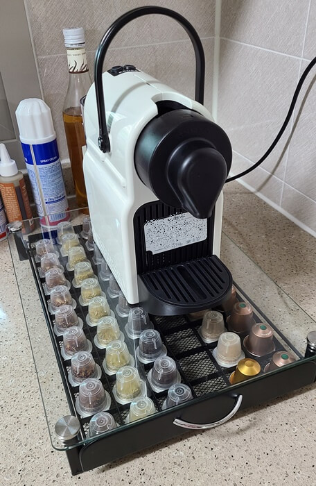 제가 구입한 제품은 네스프레소 이니시아 커피머신 화이트 - XN1001 이고요. 웰컴팩으로 샘플 캡슐 14종이 포함되어 있었습니다. 하나하나 맛보는 재미가 있었어요. 위의 사진에서 머신 밑에 있는 건 네스프레소 캡슐 보관함인데요. 2만 원가량 주고 따로 구매했어요. 강화유리라서 사진처럼 머신을 위에 안전하게 올려두고 사용할 수 있고, 커피 캡슐 넉넉하게 60개 보관할 수 있습니다.