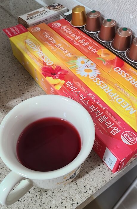 히비스커스 피치블라썸, 캐모마일 씨트러스, 자두 퐁당 홍차 티 캡슐, 돼지감자 티 캡슐 구매했는데 모두 다 생각보다 맛있었어요. 티백을 우려내서 먹는 것과는 차원이 다른 진함이 있었습니다. 특히 자두 퐁당 홍차는 가족 모두가 좋아하더라고요.