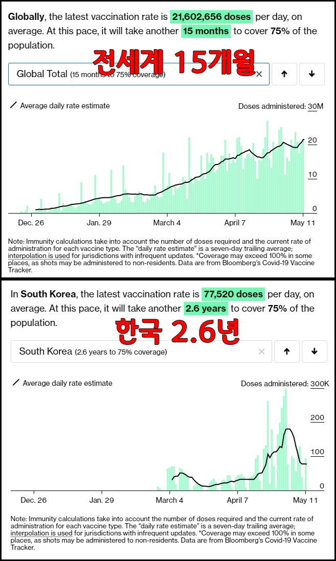 미국 경제지인 Bloomberg 홈페이지 내용을 살펴보면, 미국 정부는 국민의 70~85%가 코로나 백신을 접종했을 때 일상으로 돌아갈 수 있다고 말하고 있습니다. Bloomberg가 예측한 바에 따르면, 지금과 같은 속도일 경우 15개월 정도면 전 세계 인구의 75%가 코로나 백신 접종을 마칠 수 있다고 합니다.