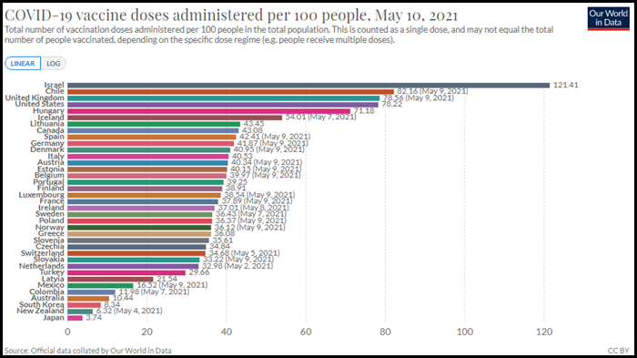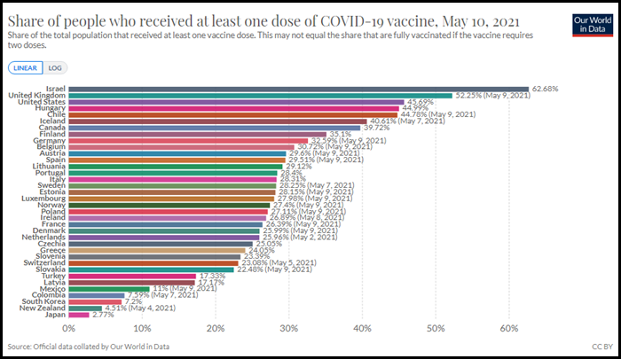 옥스포드대학교 마틴스쿨 집계에 따르면 한국의 인구 대비 백신 접종률은 5월 10일 기준으로 8.34% (1차 접종 포함)이라고 하네요. 우리나라의 백신 접종률은 OECD 37개국 중 35위이고, 이스라엘, 칠레, 영국, 미국, 헝가리가 인구 대비 높은 백신 접종률을 보이고 있습니다