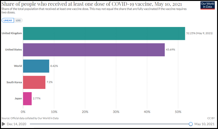 마틴스쿨에 따르면, 1회 이상 코로나 백신 접종한 인구 비율은 전세계 (8.42%), 한국 (7.2%), 미국 (45.69%), 영국 (52.25%), 일본 (2.77%)이며, 접종을 완료한 인구 비율은 전 세계 (4.1%), 한국 (1.14%), 미국 (34.54%), 영국 (26.3%), 일본 (0.97%)입니다.
