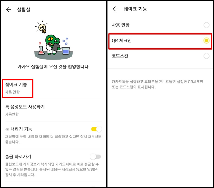 - 쉐이크 기능으로 들어가 QR 체크인 선택한다.
