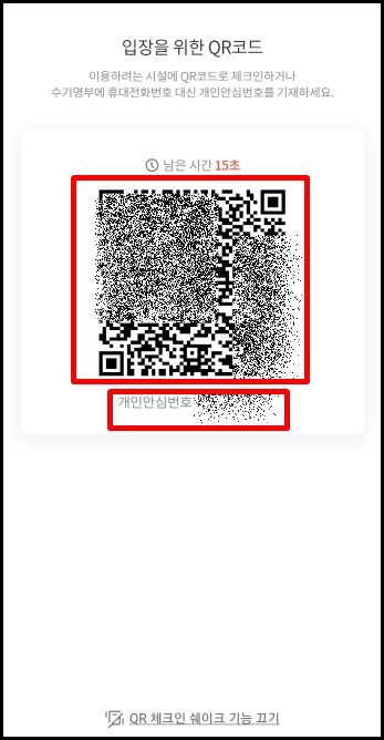 카톡 앱이 실행하고 흔들기만 하면 1초만에 큐알코드가 딱 나옵니다. 이용하려는 시설에 큐알코드 스캐너가 있으면 큐알코드로 체크인하면 되고, 없다면 수기 명부에 휴대전화번호 대신 개인 안심번호를 기재하면 됩니다.