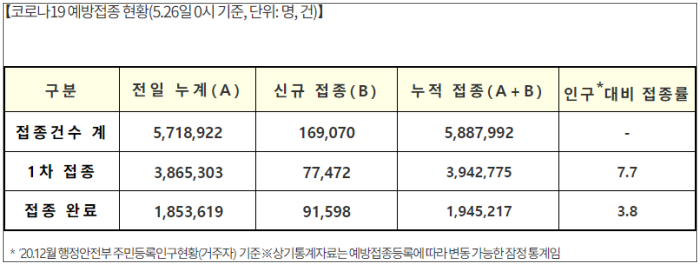5월 26일 0시 기준 코로나19 예방접종 대응 추진단에 따르면, 총 3,942,775명이 1차 접종을 받았고, 총 1,945,217명이 2차 접종까지 완료하였다고 합니다. 인구 대비 접종률을 보면 1차 접종 인원이 7.7%이고, 2차까지 접종 완료한 인원은 3.8%입니다.