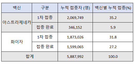 아스트라제네카 1차 접종 누적 인원은 2,069,749명, 접종 완료한 누적 인원은 346,152명이고, 화이자는 1차 접종 누적 인원은 1,873,026명이고, 접종 완료한 누적 인원은 1,599,065명입니다. 백신별 누적 접종자를 전체 백신 접종자로 나눈 값으로 백신별 누적 접종률을 구해봤더니, 화이자가 59%, 아스트라제네카가 41%입니다. 주변에 아스트라제네카 맞은 사람이 많다고 생각했는데, 화이자 투여 누적 비율이 더 높았습니다.