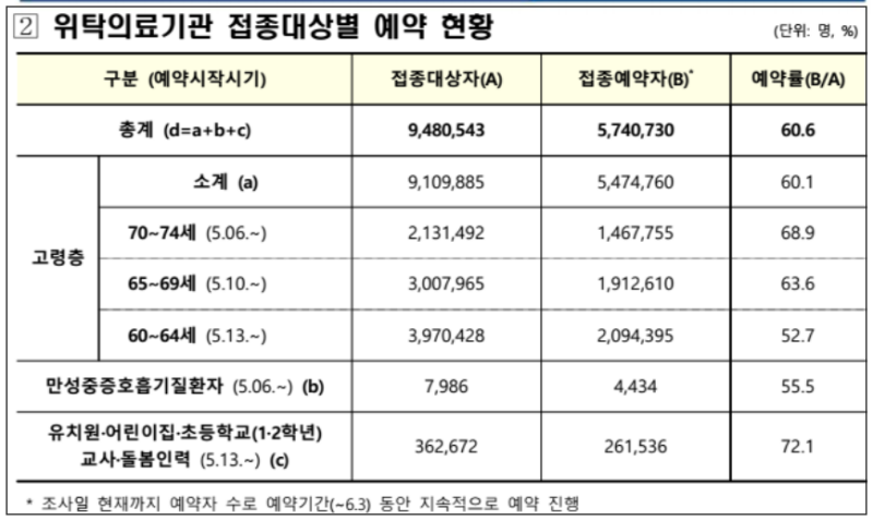 접종대상별 예약 현황을 살펴보면, 예약률이 60.6%인 걸 확인할 수 있습니다. 교사와 돌봄 인력군은 72%로 예약률이 가장 높았고, 고령층일수록 예약률이 높습니다. 전문가들이 말하길 기저질환이 있거나, 고령층일수록 코로나 백신 부작용의 위험보다 코로나에 걸렸을 경우 부작용과 위험이 더 크다고 합니다. 6월 3일까지 접종 예약을 놓치면 하반기 모든 국민들의 1차 접종이 끝난 후인 10월 이후에 다시 접종 순서가 오게 된다고 하니 참고하시길 바랄게요.