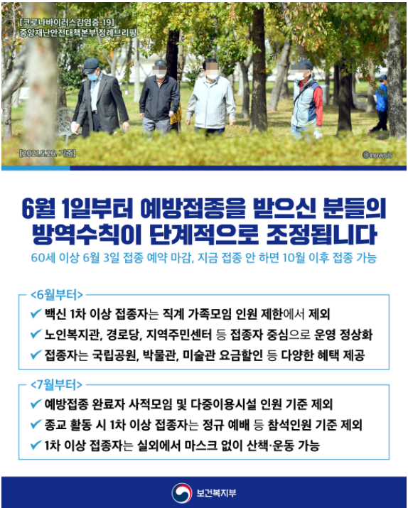 6월 1일부터 예방접종을 받으신 분들의 방역수칙이 단계적으로 조정이 된다고 합니다. 보건복지부에서 5월 26일 발표한 내용을 간단히 살펴보겠습니다.